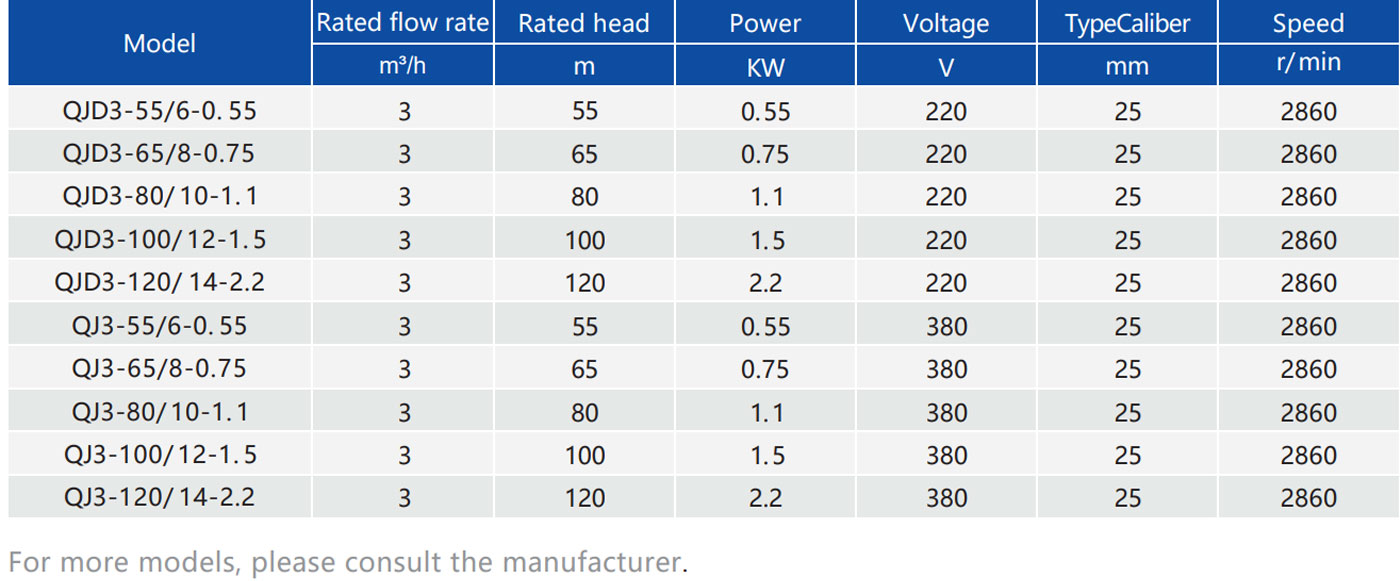 The stainless steel QJD deep well pump is an integrated water-lifting device with the motor directly connected to the pump and submerged in water for operation. It is suitable for extracting groundwater from deep wells and can also be used for water-lifting projects in rivers, reservoirs, and canals. It is mainly used for farmland irrigation and water supply for humans and livestock in plateaus and mountainous areas. It can also be used for water supply and drainage in cities, factories, railways, mines, and construction sites.