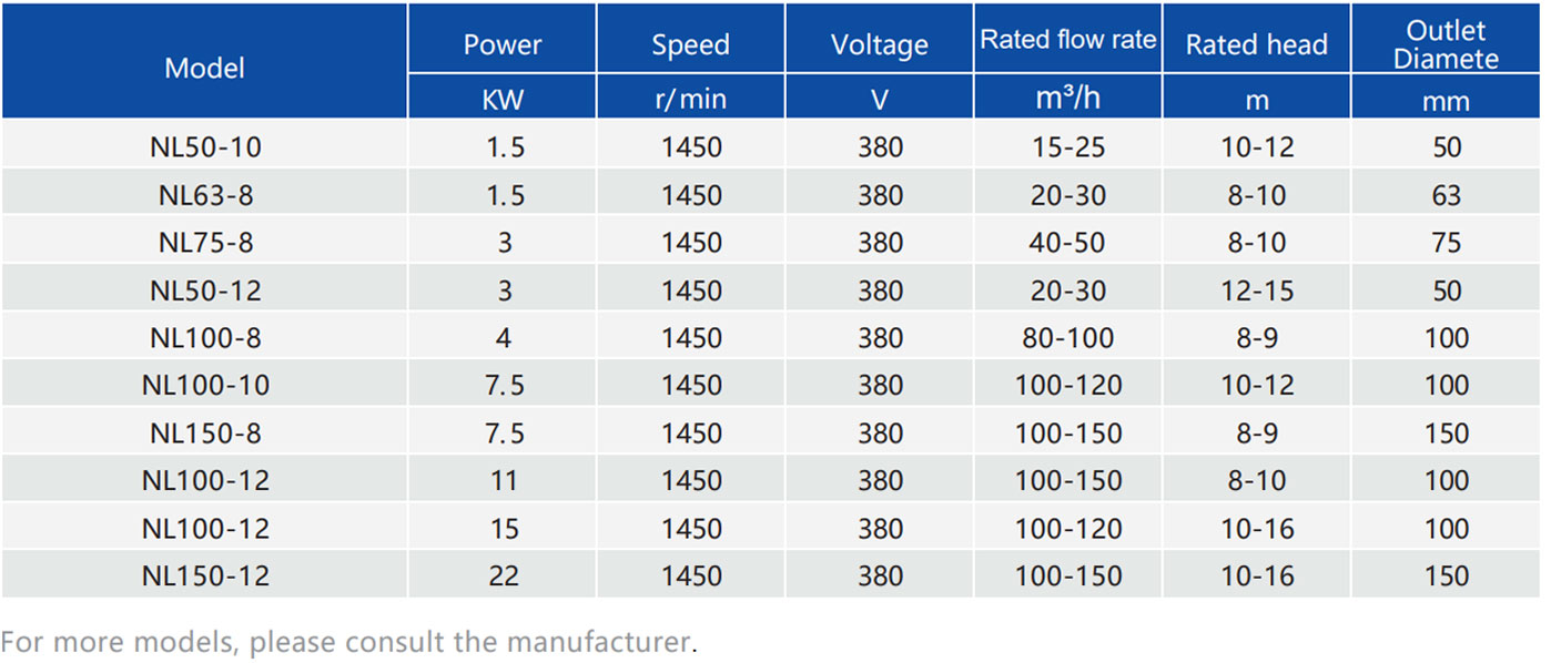 This pump is a single-stage single-suction vertical centrifugal pump, primarily composed of volute, impeller, pump seat, pump casing, support cylinder, motor seat, and motor. The volute, pump seat, motor seat, and impeller nut are made of cast iron, offering good corrosion resistance and easy machining. The impeller has three single-curved blades and adopts a semi-open design. Made of malleable cast iron, it has high strength, good corrosion resistance, easy machining, excellent passability, and high efficiency. To reduce weight and machining effort, the pump shaft is made of high- quality cold-drawn carbon steel round bar. The pump seat contains four skeleton oil seals and a shaft sleeve to prevent shaft wear and extend its service life. The NL series sewage slurry pump can be used vertically or inclined, requiring minimal floor space. The volute must be submerged in the working medium for operation, making it easy to start without the need for priming. The rotational direction should be clockwise when viewed from the motor's rear. Various specifications of the total pump length are available, allowing users to choose the appropriate model based on application needs.