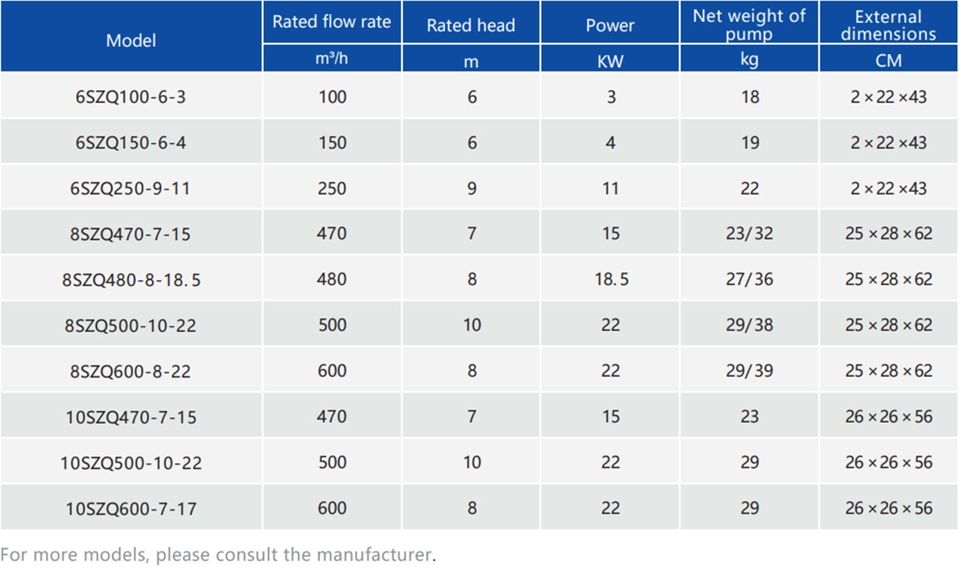 SZQ stainless steel permanent magnet flood control pump features an axial flow impeller and represents the advanced application of permanent magnet synchronous motors in pumps. Its characteristics include high efficiency, lightweight design, compact size (weighing only one-fourth of conventional axial flow pumps), large flow capacity, and easy portability. The pump's speed is infinitely adjustable, allowing for control of head height and flow rate. Additionally, the permanent magnet synchronous motor ensures that the speed remains constant regardless of fluctuations in power grid voltage. Even when the voltage is relatively low, the pump can maintain consistent head and flow rate, a performance advantage over traditional pumps. The impeller is made of stainless steel precision casting, the pump shaft is stainless steel, and the housing and pump body are available in both aluminum alloy and stainless steel. The wire outlet features a rubber sheath with an added stainless steel spring protector for safe and reliable use.