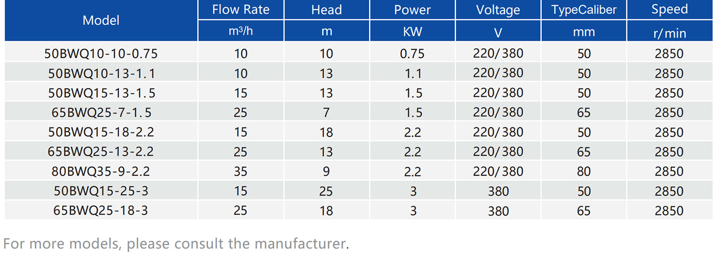 BWQ products are used for sewage discharge in areas with explosive mixtures of combustible gases or vapors and air in factory Zone IIB, with temperature groups T1-T4. They are suitable for coal chemical industry, petrochemical industry, municipal projects, urban industry, hospitals, hotels, residential communities, and other locations.