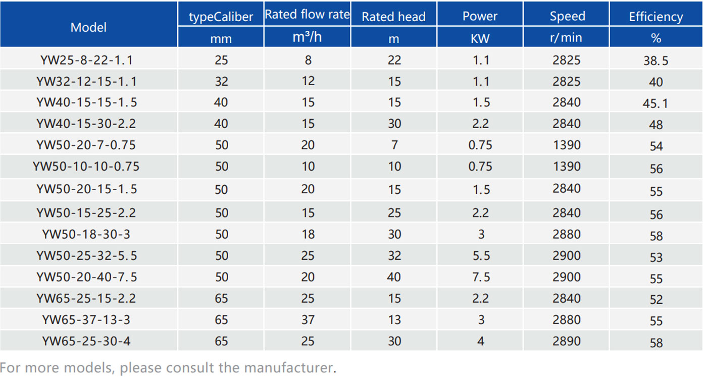 The pump is mainly used in environmental protection, municipal engineering, thermal power plants, coal gasification plants, refineries, steel plants, mining, paper mills, cement plants, food factories, dyeing, and other industries. It is suitable for pumping thick liquids, viscous oil, oil residues, turbid liquids, mud, slurry, quicksand, and flowing sludge from urban sewage ditches, as well as fluids containing sediment or corrosive liquids. The YW pump can also be used for pumping human and animal waste in large and medium-sized biogas tanks and for discharging materials in biogas projects.